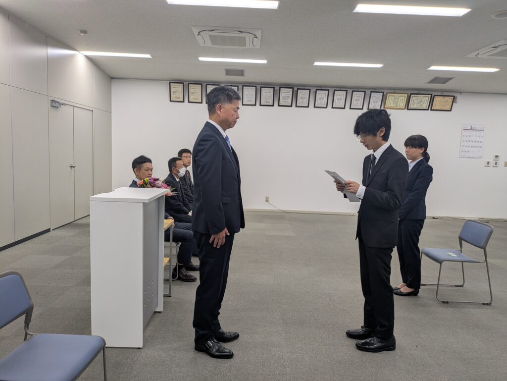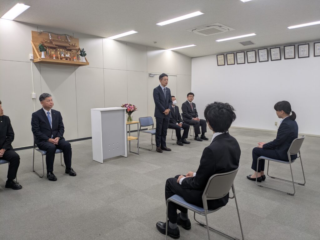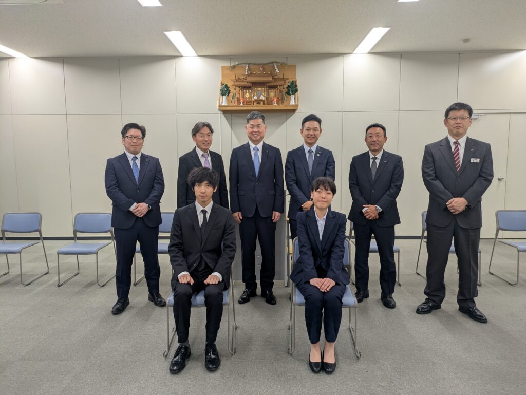 2026年4月1日、本社にて2026年度の入社式を行いました。今年は大卒1名、高卒1名の計2名の新入社員を新たに迎えました。